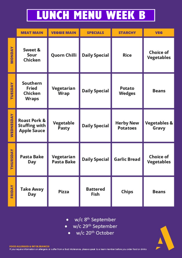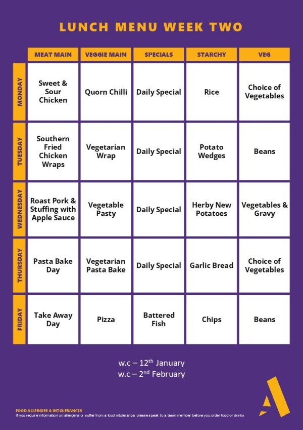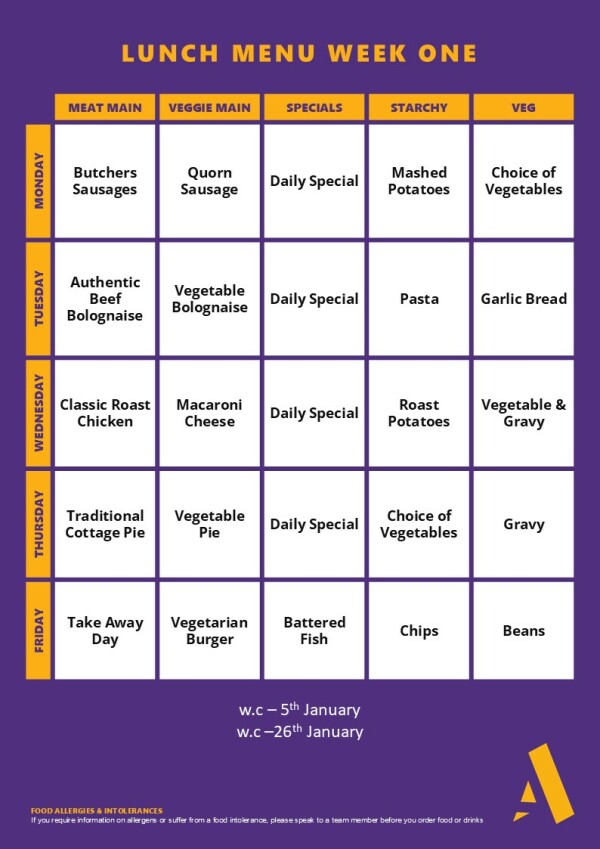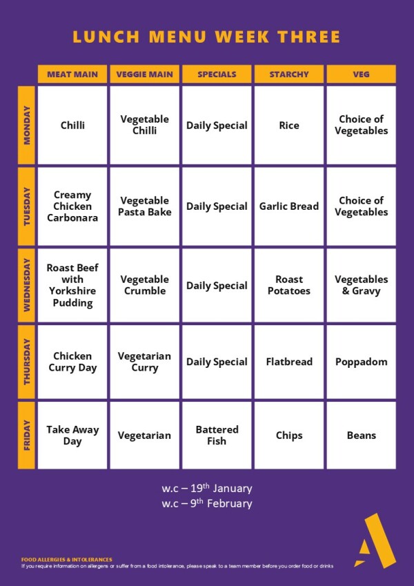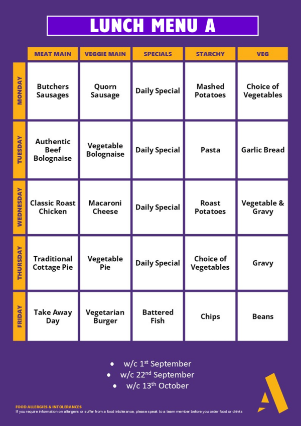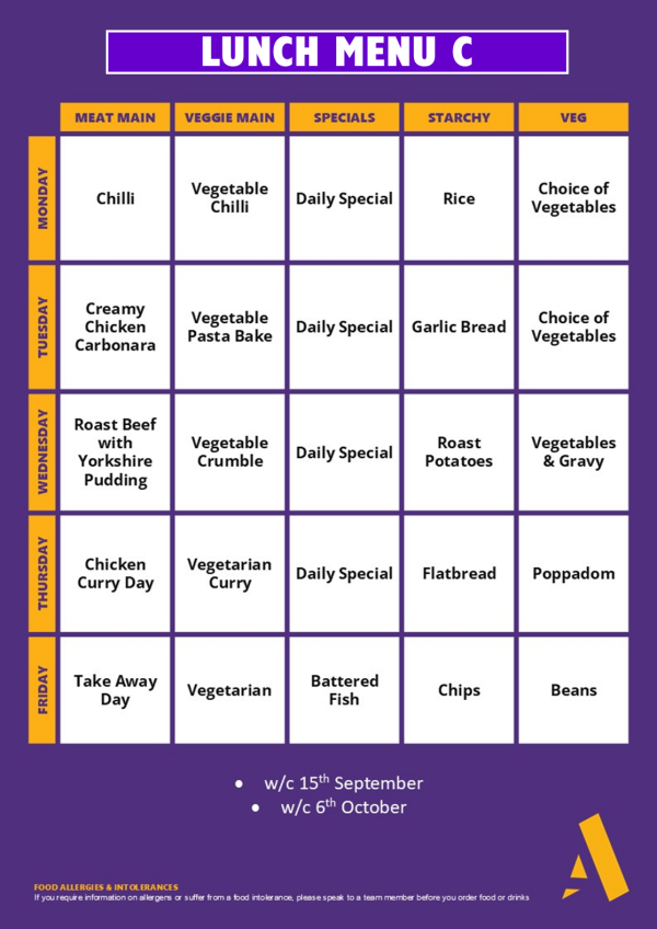 The main meals are served in rotation of three menu’s - Week A, Week B and Week C.