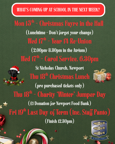 Also on Thursday, we have our charity ‘winter’ jumpy day. Donations of £1 for Newport Food Bank and come in your festive gear!