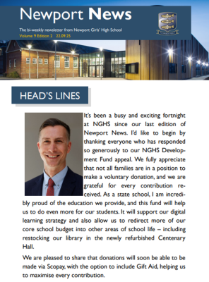 22 September 2025 The latest edition of Newport News, our bi-weekly newsletter, is available to download now! As the vast majority of you read the newsletter on a phone we've made some changes to the layout and it should now be much easier to read! Grab your copy here: https://www.nghs.org.uk/for-parents/newport-news