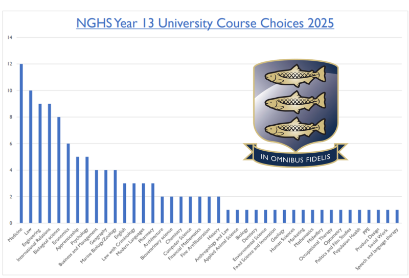 Destination data for Year 13 leavers is shown below. Medicine and Law were the two most popular subjects for our students, closely followed by International Relations and Engineering.